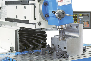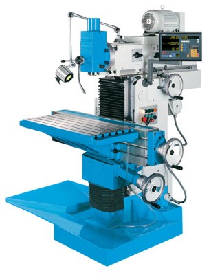 einem vertikalen Fräskopf ausgerüstet, der um +/- 90° geschwenkt werden kann. Eine Gradskala erleichtert das Ablesen der eingestellten Gradzahl. Die Pinole ist großdimensioniert, hat einen Hub von 80 mm und wird mechanisch über einen Hebel geklemmt. Der Einsatz der Horizontal- fräseinrichtung erfolgt nach Demontage des Vertikalfräskopfes mittels Schwenkvorrichtung, des Verschiebens des Oberbalkens, sowie der Montage des Gegenhalters. Umbau- und Rüstkosten sind sehr gering. Alle 3 Achsen der Maschine verfügen über automatische Vorschübe und Eilgänge. Die Achsen X und Z werden über einen einzigen Richtungshebel ein- und ausgeschaltet. Für den Quervorschub Y steht ein separater Hebel am Oberbalken zur Verfügung. Darüber hinaus können die Achsen über skalierte Handräder manuell verfahren werden. |